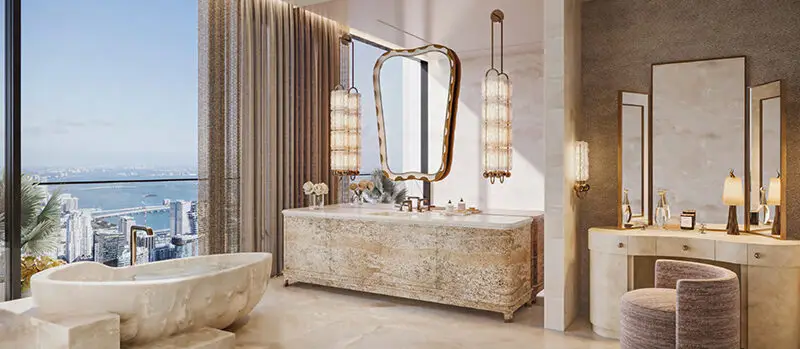 Layouts range from 2,435 to 11,150 square feet, including half-floor duplexes and a breathtaking trophy penthouse with a private pool. Expect Venetian chandeliers, floor-to-ceiling windows, standalone soaking tubs, and Sub-Zero appliances.